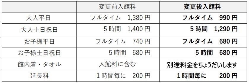 物価高騰が続く中、皆さまへ温かな癒しの時間をお届けしたいという想いから、オアシスはゆったりCOcoの入館料改定(一部料金の値下げ)を行うことにいたしました。