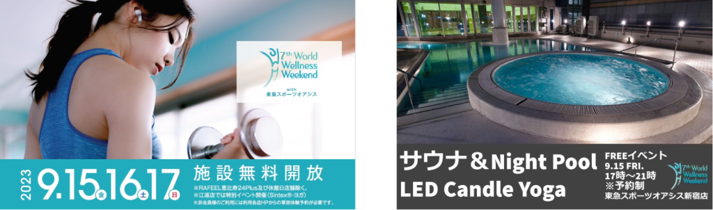 「Well-being First!」を企業ミッションに掲げる、株式会社東急スポーツオアシス(本社:東京都墨田区、代表取締役社⻑:⼭岸 通庸、以下「オアシス」)は、国際スポーツ&ウェルネスウィークエンド(World Wellness Weekend(以下、WWW))に参加し、2023 年9 月15 日(⾦)〜17 日(日)の期間中、オアシス全店の施設をご利用いただける機会の提供や、新宿店では特別な一夜をご提供するウェルネスイベントを開催します。