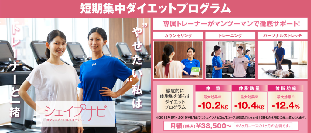 ダイエットを短期集中で取り組みたい方にはオアシスのダイエットプログラム「シェイプナビ」の提案が可能です。