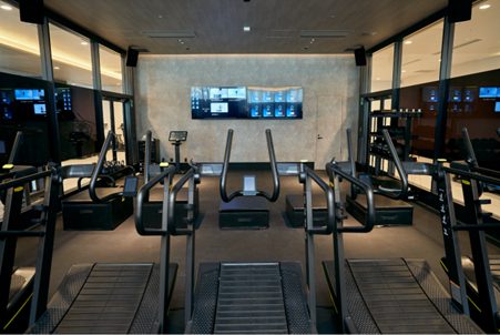 <TRAINING&HIIT> 本施設には最新かつ最先端の設備(テクノジム社製)を揃えたトレーニングジムをご用意しています。ジムエリアでは各種トレーニングマシンに加えて、数十秒間の強い負荷の運動と、短時間の休憩や負荷を落とした運動を繰り返す“HIIT(High Intensity Interval Training)”プログラムを提供します。初心者から上級者まで幅広い体力レベルに合わせた1クラス30分または45分のプログラムを通じて、忙しいワーカーの方でも効率的に運動の成果を得ることができます。短時間・高強度のトレーニングに集中することで大きな達成感を得るとともに、心身を思考や悩みから解放し、“からっぽ”な状態へと導きます。 その他、5室設けられた専用個室でのパーソナルトレーニングも提供します。パーソナルトレーニングは株式会社PCPとタッグを組み、最先端で働くビジネスパーソンのパフォーマンスアップにフォーカスします。 ※パーソナルトレーニングは入会金・会費とは別料金です。