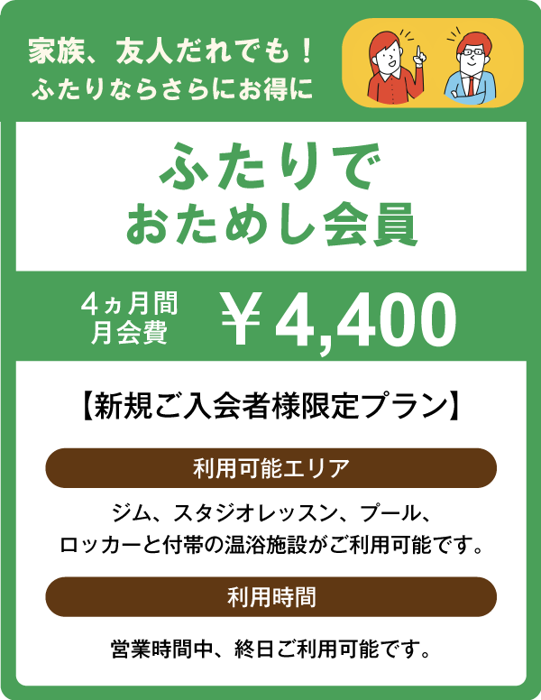 ※無料期間終了後は通常月会費に自動移行となります。解約をご希望される場合はフロントにてお手続きください。