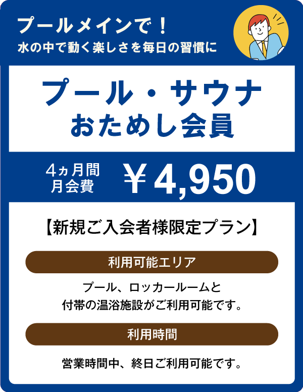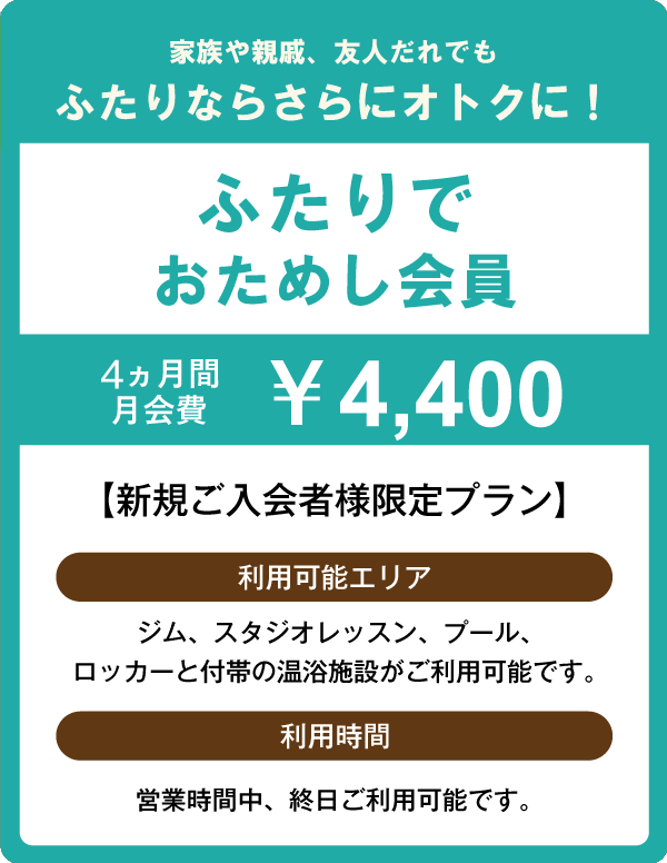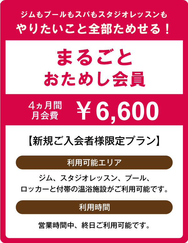 ●プール・サウナおためし会員はジムエリア・スタジオをご利用いただけません。ご利用の場合は他の会員プランをご選択ください。