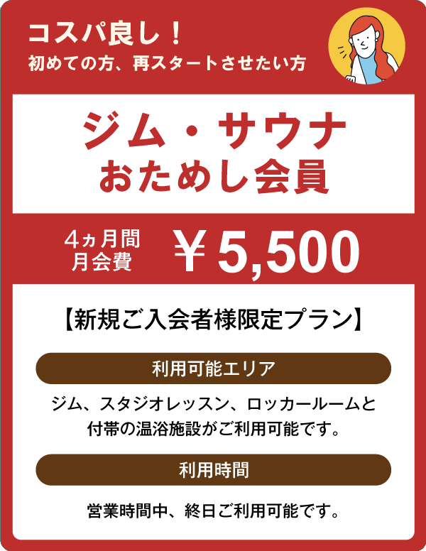 ●最長4ヵ月、新規ご入会者様限定の会員プランで、8ヶ月以上在籍の方に限ります。期限内でご解約の場合、解約金9,350円をお支払いいただきます。