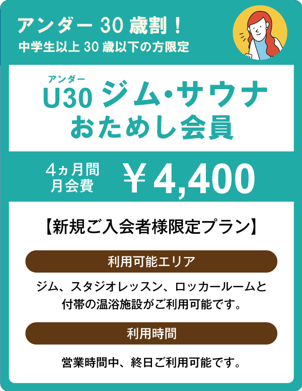 ●アンダー30ジム・サウナおためし会員は中学生以上30歳以下の方限定のプランです。