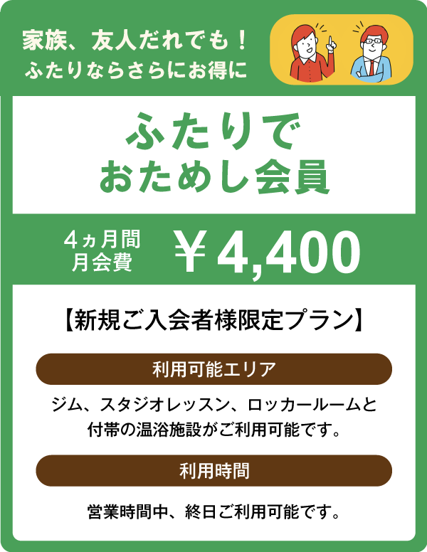 ※無料期間終了後は通常月会費に自動移行となります。解約をご希望される場合はフロントにてお手続きください。