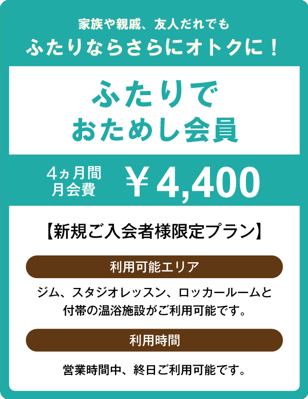 ※無料期間終了後は通常月会費に自動移行となります。解約をご希望される場合はフロントにてお手続きください。