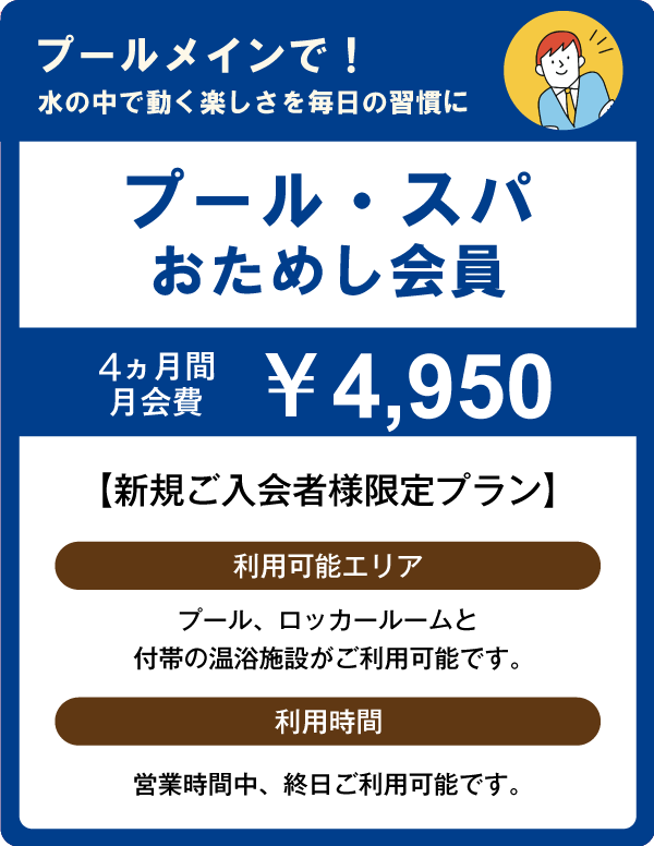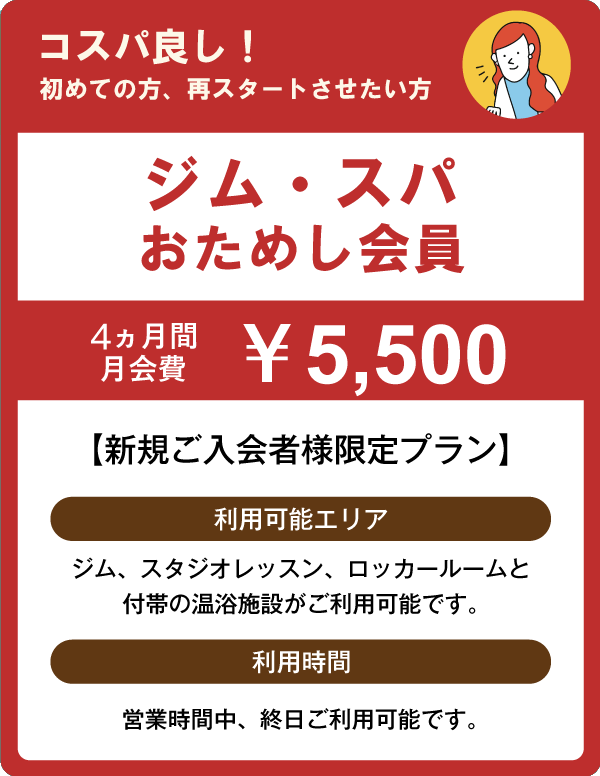 ●最長4ヵ月、新規ご入会者様限定の会員プランで、8ヶ月以上在籍の方に限ります。期限内でご解約の場合、解約金9,350円をお支払いいただきます。