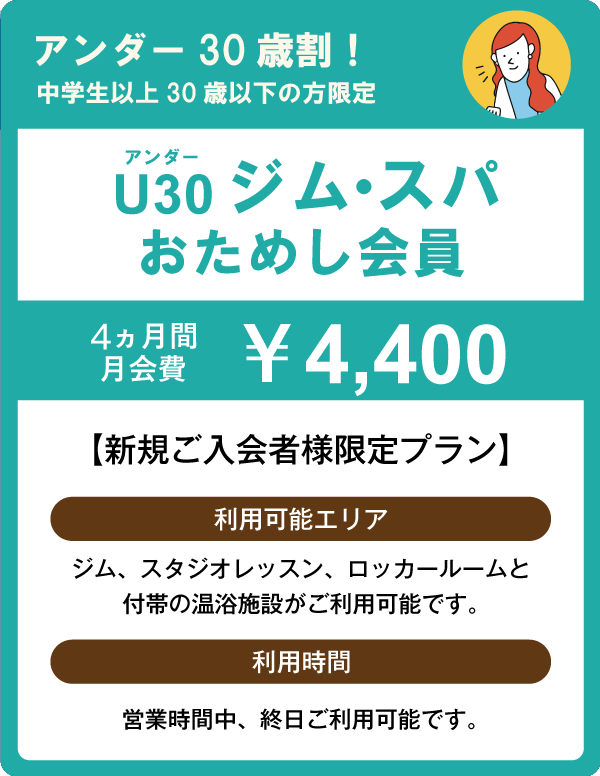 ●アンダー30ジム・スパおためし会員は中学生以上30歳以下の方限定のプランです。