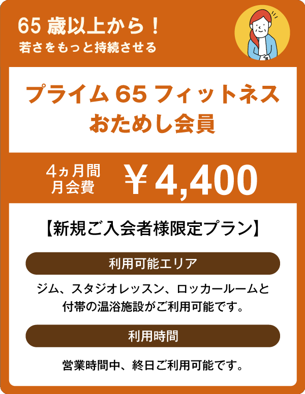 | プライム65フィットネスおためし会員 | 4,400円 | ○ | ○ | ○ |