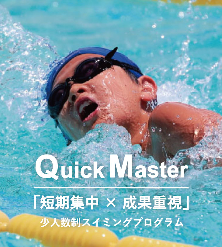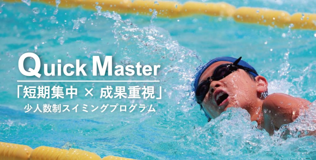 QMは通常の短期教室に比べ最大実施人数を4名までとし、また自宅でも練習が出来る「陸トレ動画」やお子様自身の泳ぎを撮影し、コーチと一緒に泳ぎの確認が出来る「映像確認レッスン」が加わり、短期間で習得の出来る要素満載のプログラムです。