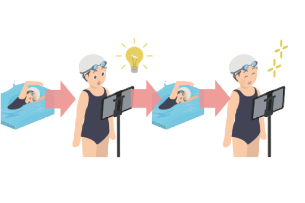 自分の泳ぎをその場で確認できます。リアルな映像で見られることでコーチからのアドバイスも理解しやすく、「自分で見て課題に気づく」アクティブラーニングにもつながります。