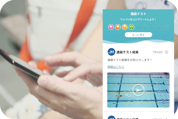 お子様の成長をサポートするオンラインサービスと、自分の泳ぎを映像で確認できるシステムを使ったレッスンで、更なる上達へ導きます。