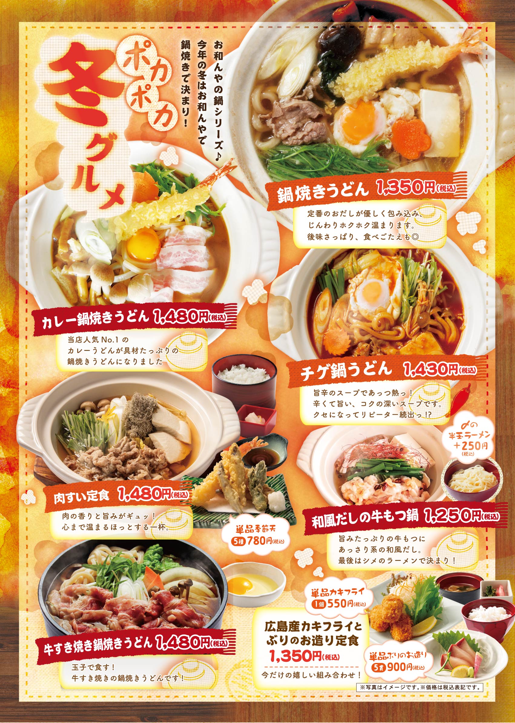 レストラン「お和んや」冬のおすすめメニュー!! 2025/12/25 店舗からのお知らせ レストラン「お和んや」冬のおすすめメニュー!! ゆったりCOcoをご利用いただき誠にありがとうございます。レストラン「お和んや」冬のおすすめメニューご紹介いたします。皆さまのご利用をお待ちしております。 VC都筑_冬メニュー2025_ver1ダウンロード VC都筑店スタミナメニュー第11弾_202511_ver1ダウンロード