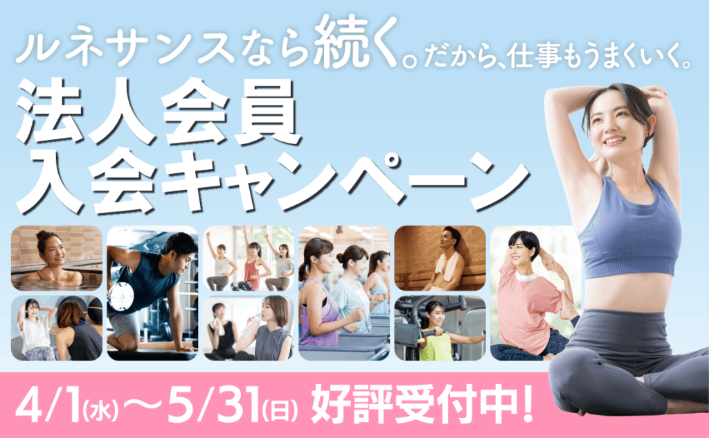 【5/31(日)迄】 法人会員入会キャンペーン|全国のルネサンスが使える「法人ジム・サウナおためし会員」も今なら月会費1カ月分無料!