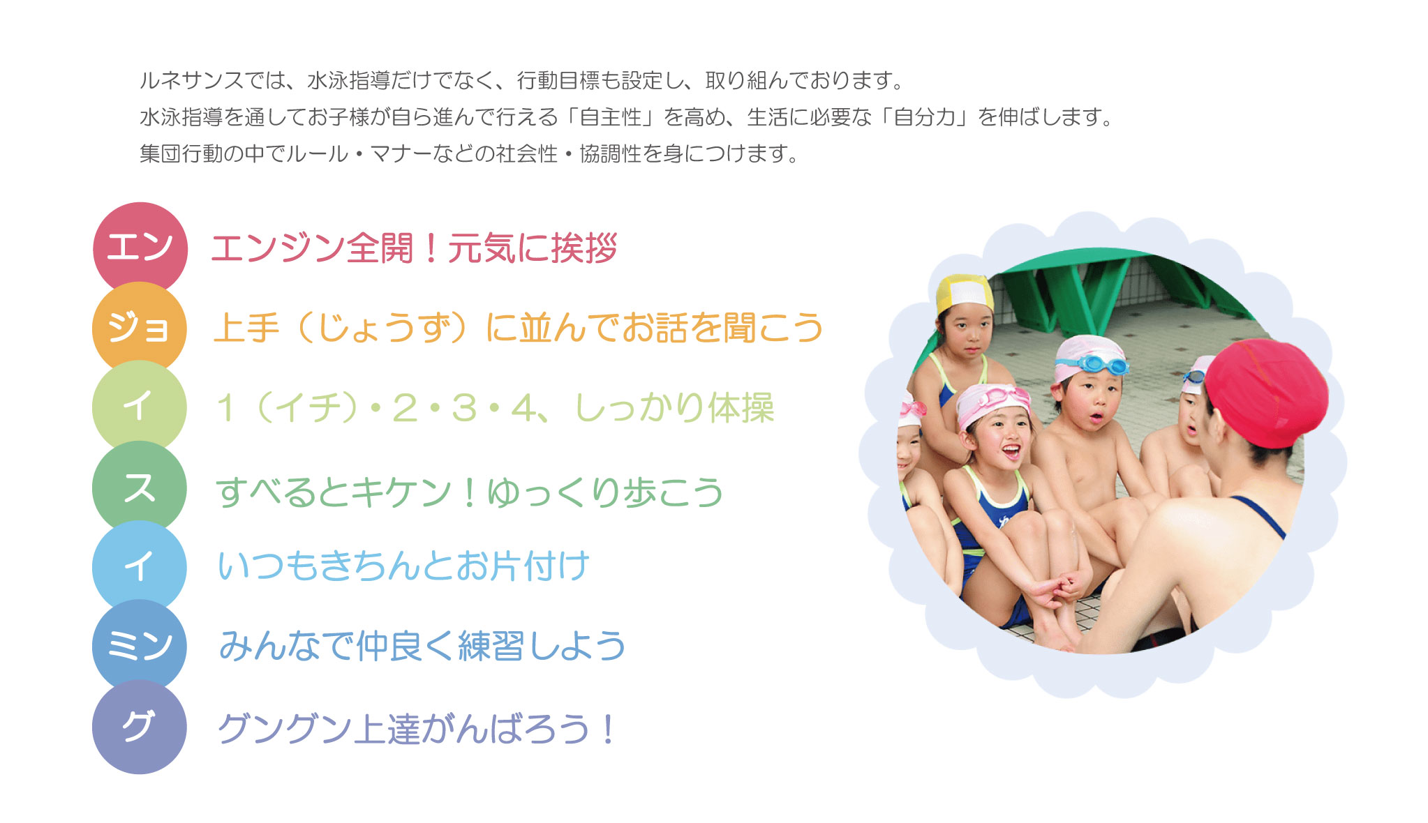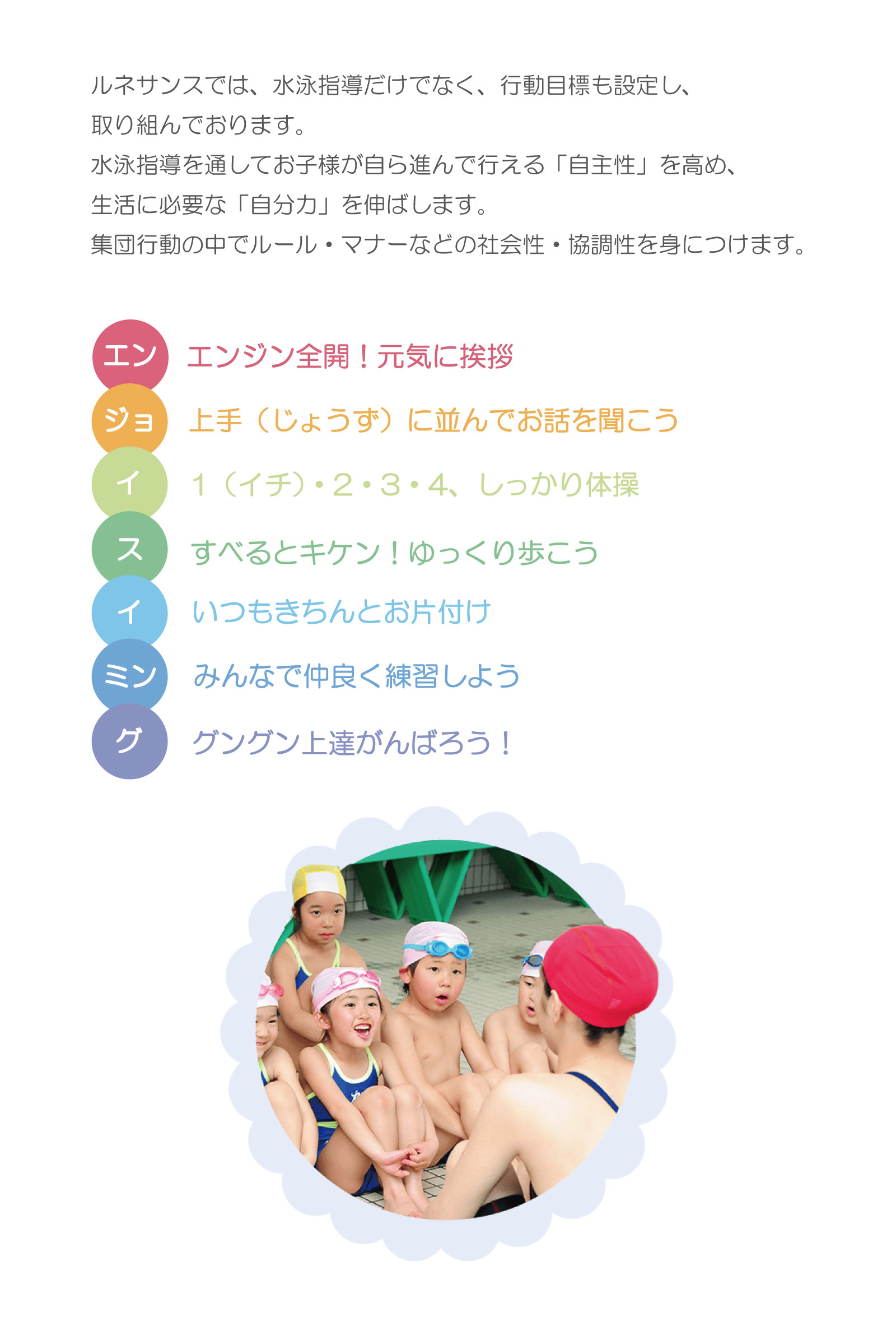 ルネサンスのスイミングスクールは「エンジョイスイミング」をコンセプトに「知育・徳育・体育」の3つをバランスよく形成しつつ、健全な心と身体を育むことを目標としています。
