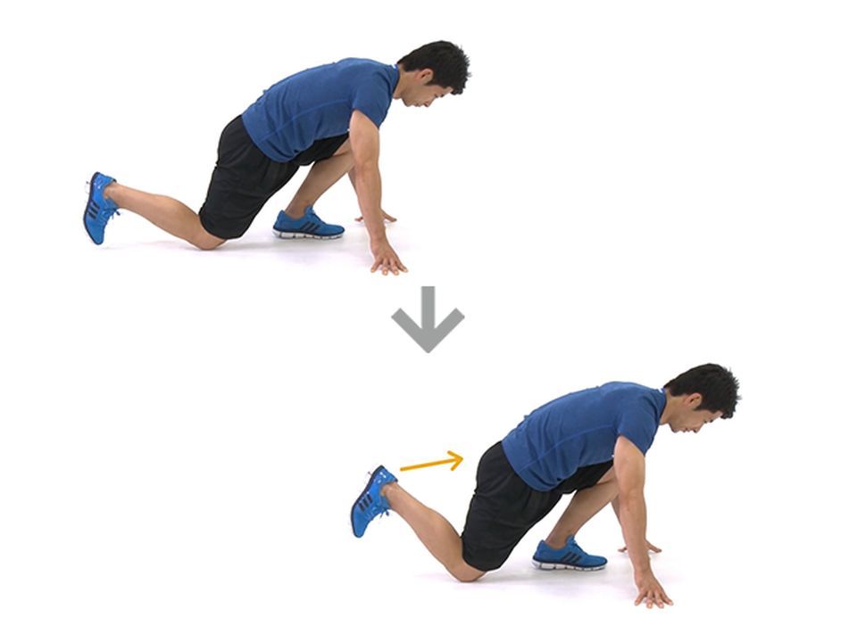 2.前についた手でバランスを保ちながら、片足のかかとをお尻に近づけるようなイメージで曲げてください。