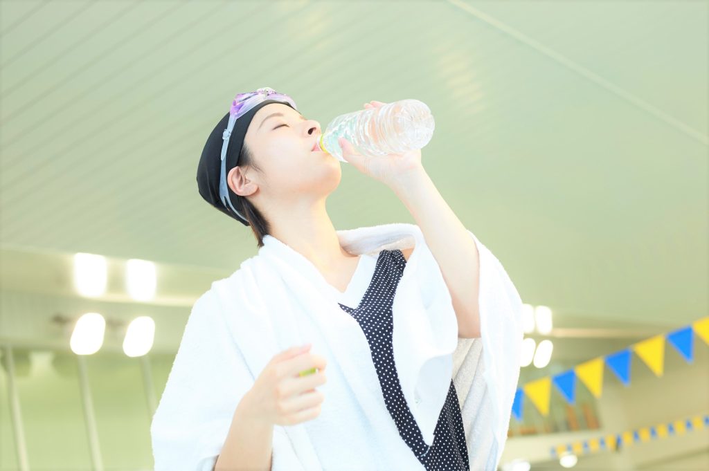 運動の前後はしっかりと水分補給をするようにしましょう。水に身体が浸かっていると分かりにくいのですが、プールの中でも人間は汗をかいています。脱水症状を引き起こさないよう注意が必要です。