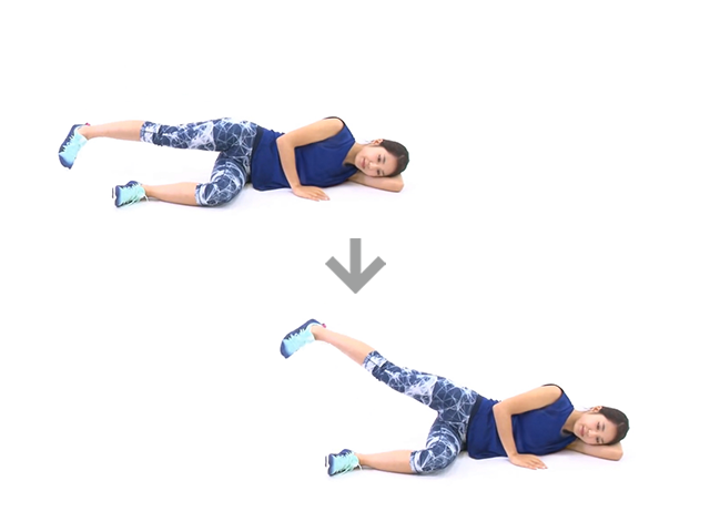 1. 横向きに寝た状態で、上側の脚を斜め後ろに引きながら上下に動かします。