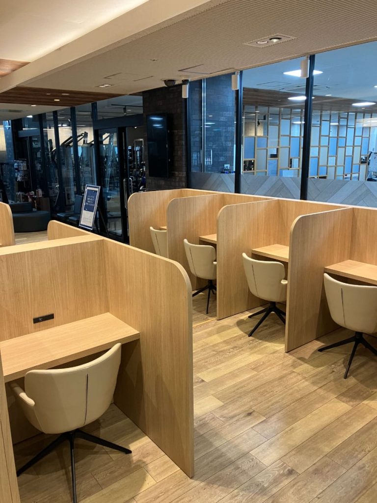 RAFEEL港北は、フィットネス施設だけでなく、コワーキングエリアも完備。Wi-Fi・電源を完備し、仕事や趣味の時間を快適に過ごせるスペースを提供します。