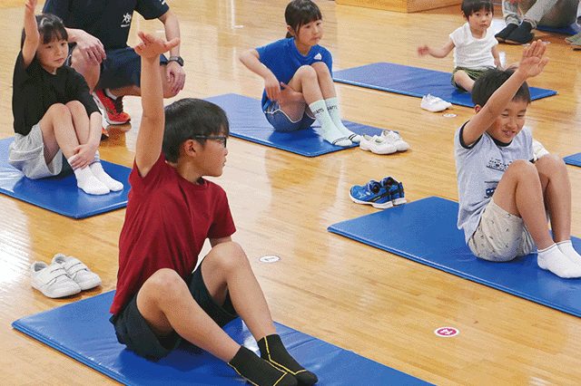元気にあいさつをしてからスタートします。準備運動や目のトレーニングを実施し、次の動きに向けてココロとカラダの準備をします。