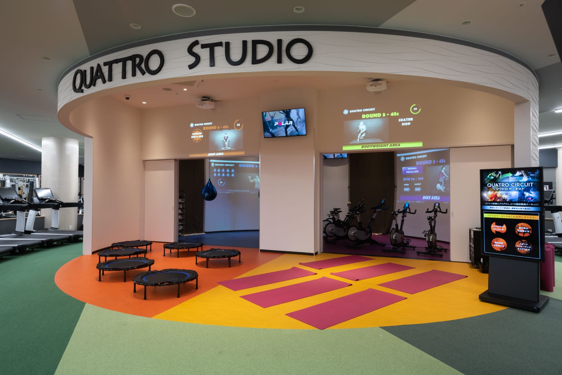 心身のリラックス効果はもちろん、姿勢改善や体幹強化も期待できるピラティス。温かいスタジオで、より深いリラックス効果が期待できるホットヨガ。音楽や照明、動画指導も駆使し、4つのプログラムを同時に楽しめる、新感覚のサーキットトレーニングを行う「クワトロスタジオ」など、バラエティ豊かなプログラムをご用意しています。