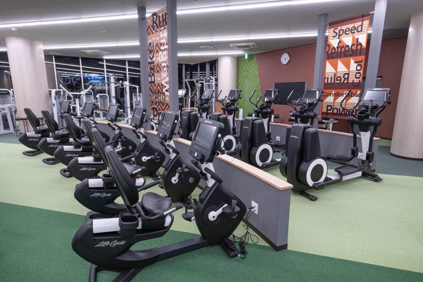 松戸クラブは、「光・風・緑・水」をコンセプトに、自然や緑溢れる内装で、心身ともにリラックスできる空間を提供しています。