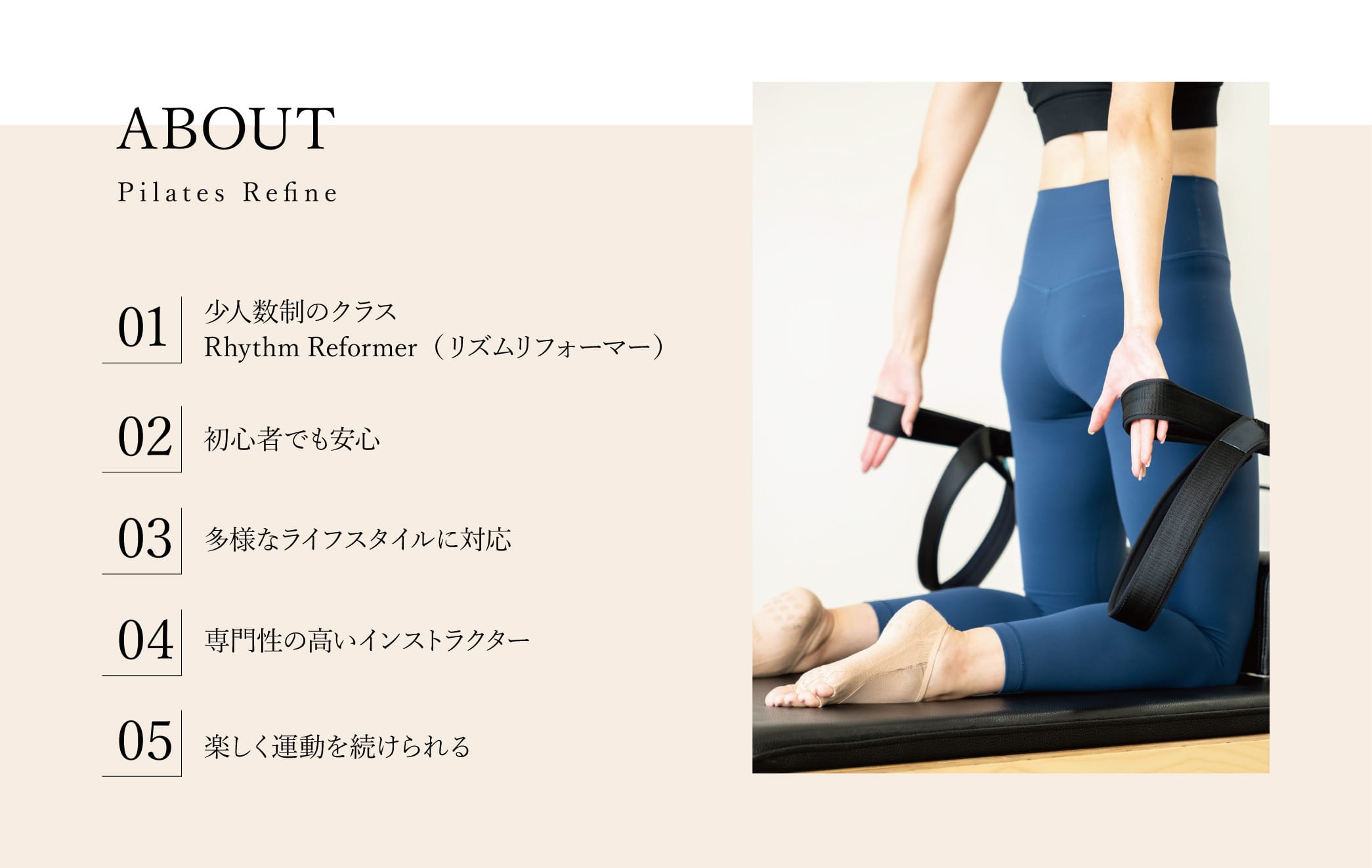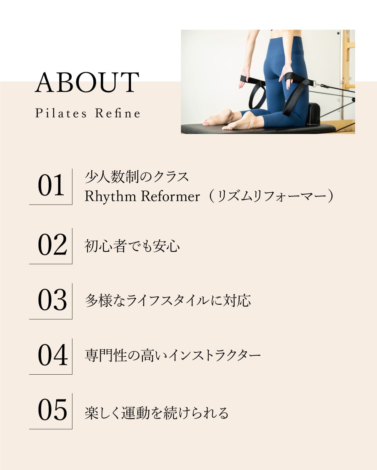 海外でサステナブルライフクリエイターとして活躍する大熊理奈(おおくまりな)監修によるRythm Refomer(リズムリフォーマー)「Rina Ohkumaオリジナルプログラム」を採用しました。プログラム前半はピラティスの基礎を学び、身体の癖や歪みを矯正します。後半はアメリカ西海岸をイメージした爽やかでリズミカルな音楽に合わせたコレオプログラムを楽しみます。